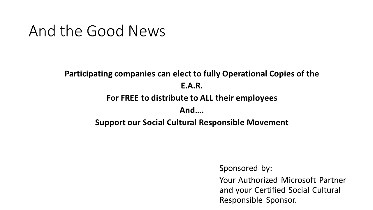 B.O.S. participating in the E.A.R. are committed to Social Cultural Responsibility. They have access to resources that support Social Cultural Responsibility to address the individual and collective challenges facing humanity – socially, economically, financially and culturally. The E.A.R. opens the door to drive the wave of AwareComm® and Microsoft’s shared Commitment to Global Empowerment announced by Satya Nadella at The Ignite Conference in Atlanta.