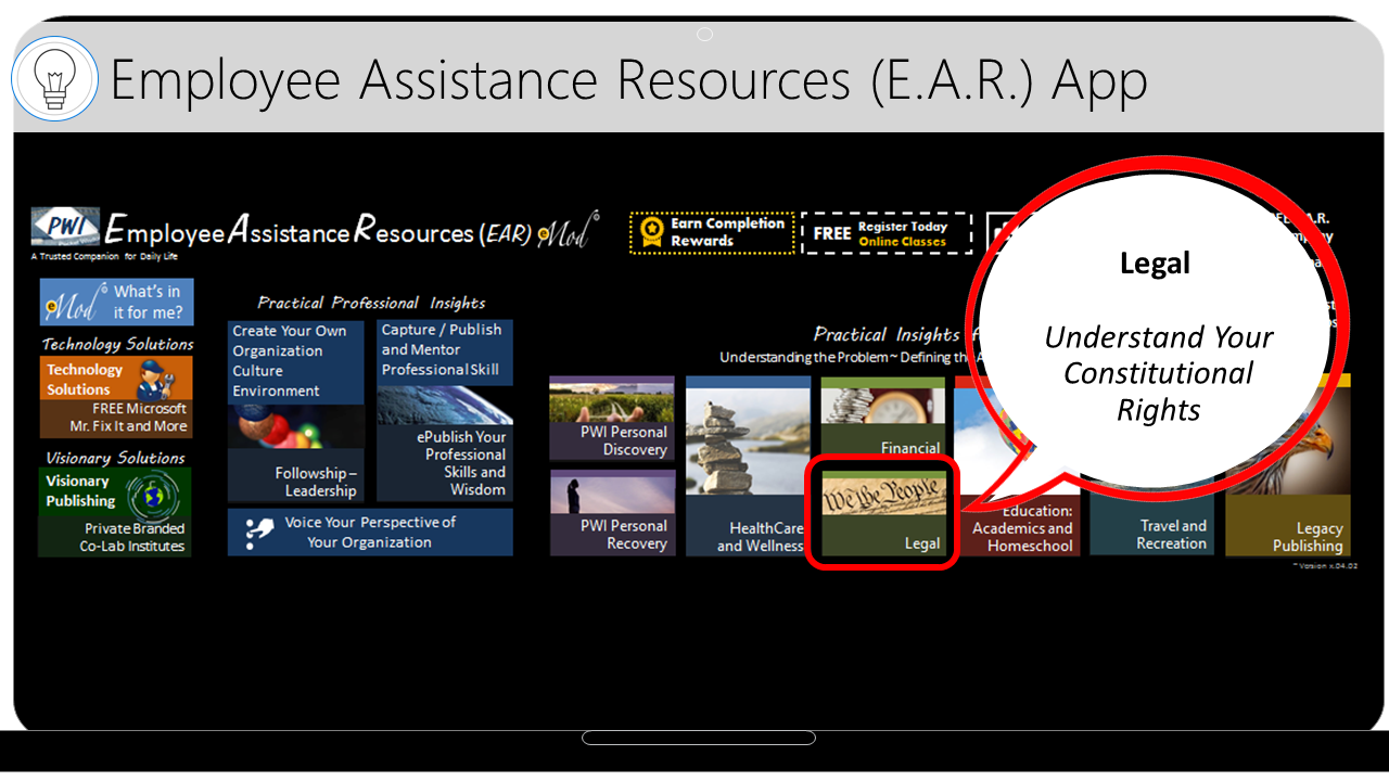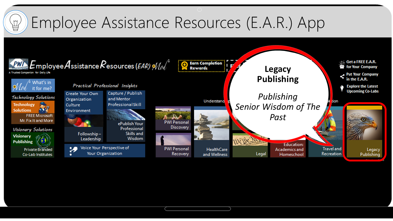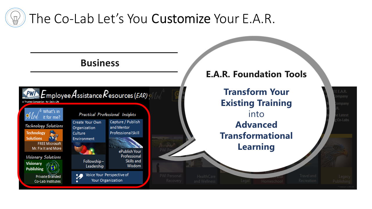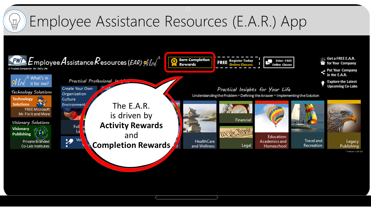 The Free E.A.R. App is scalable and customizable for each B.O.S. Additionally, organizations may elect to partner with developers to ePackage and Distribute their training into the E.A.R. and customize it for their training and marketing purposes.